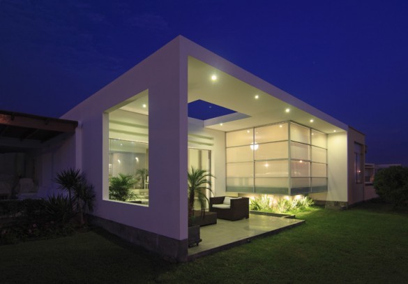 Se le pidió que la casa sea un espacio lúdico en cualquier temporada del año, así, ubicada frente al mar nos encontramos no en una casa de playa convencional sino en un mini club, dedicado a mimarnos en cada habitación. Un gran techo de concreto perforado forma la terraza y de este se cuelga formalmente el cubo de vidrio que parece suspendido alberga el dormitorio en conjunto esta es la cara que tiene la vista al mar.